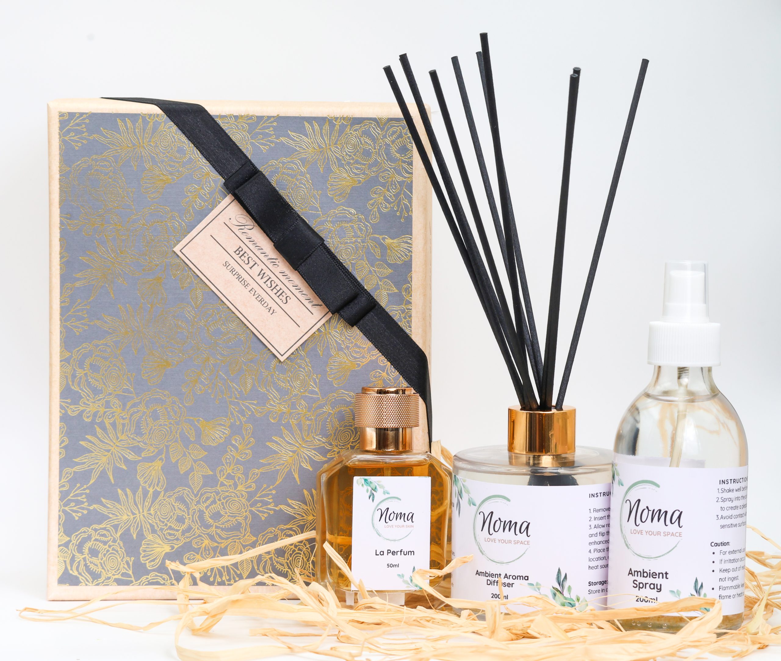 The gift set includes 50ml fragrance of your choice, Ambient Aroma Diffuser 200ml and Ambient Spray