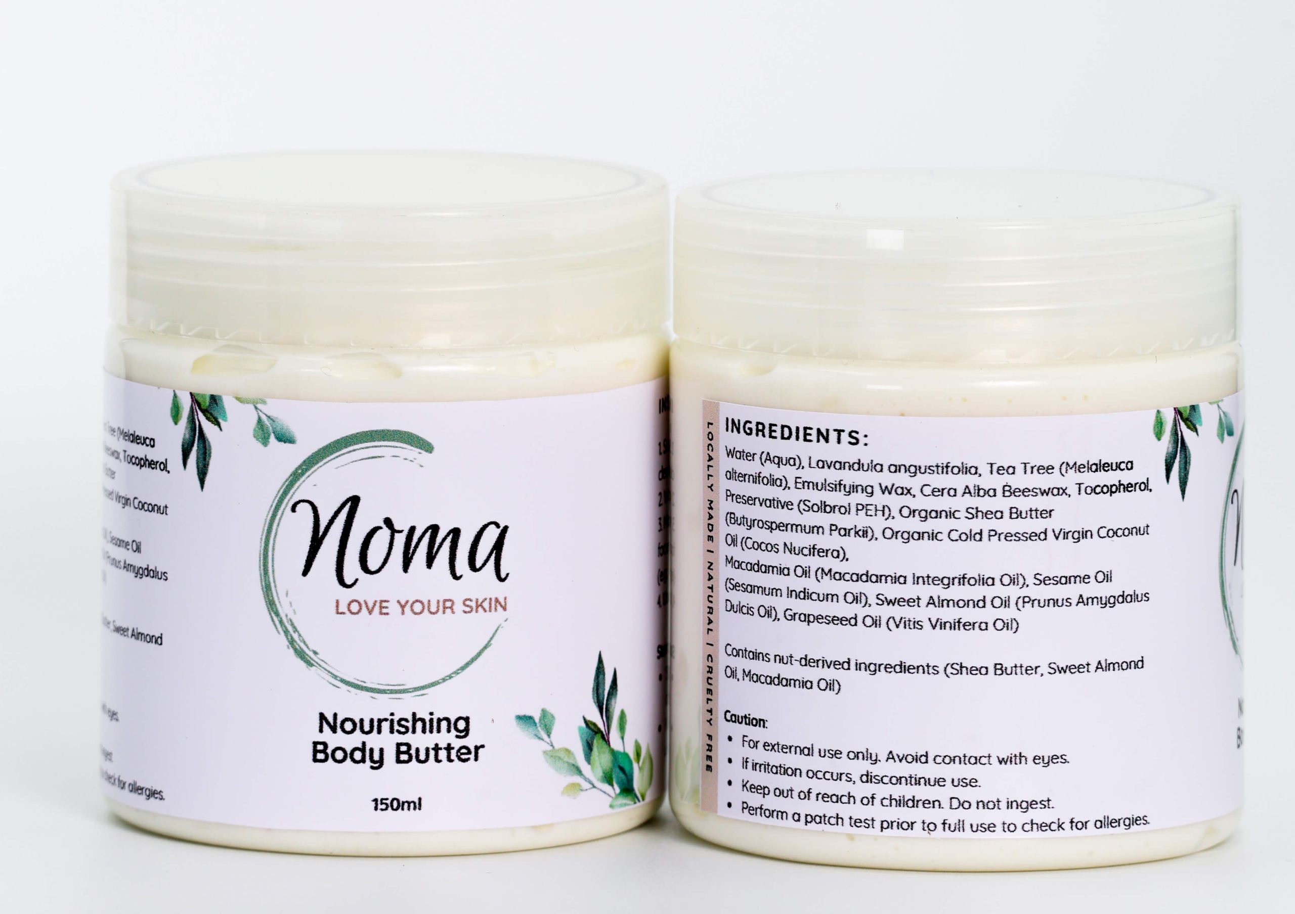 Indulge your skin with Noma’s Nourishing Body Butter, a rich and creamy blend designed to deeply hydrate and restore softness. Formulated with the finest natural ingredients, this luxurious butter melts into the skin, leaving it silky smooth without any greasy residue. Perfect for dry and sensitive skin, this nourishing butter is packed with antioxidants and vitamins that promote healthy, glowing skin. Experience intense hydration and long-lasting moisture with every use.